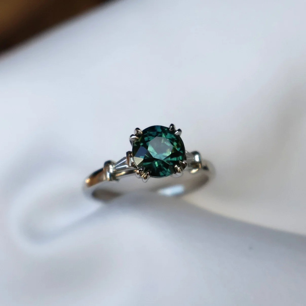 An antique-style ring, hand-crafted in platinum, featuring a stunning teal sapphire from Madagascar at its centre. Tapered baguette diamonds angle down from the center stone, connecting to the band with a subtle bar at the transition, creating a refined and elegant silhouette.