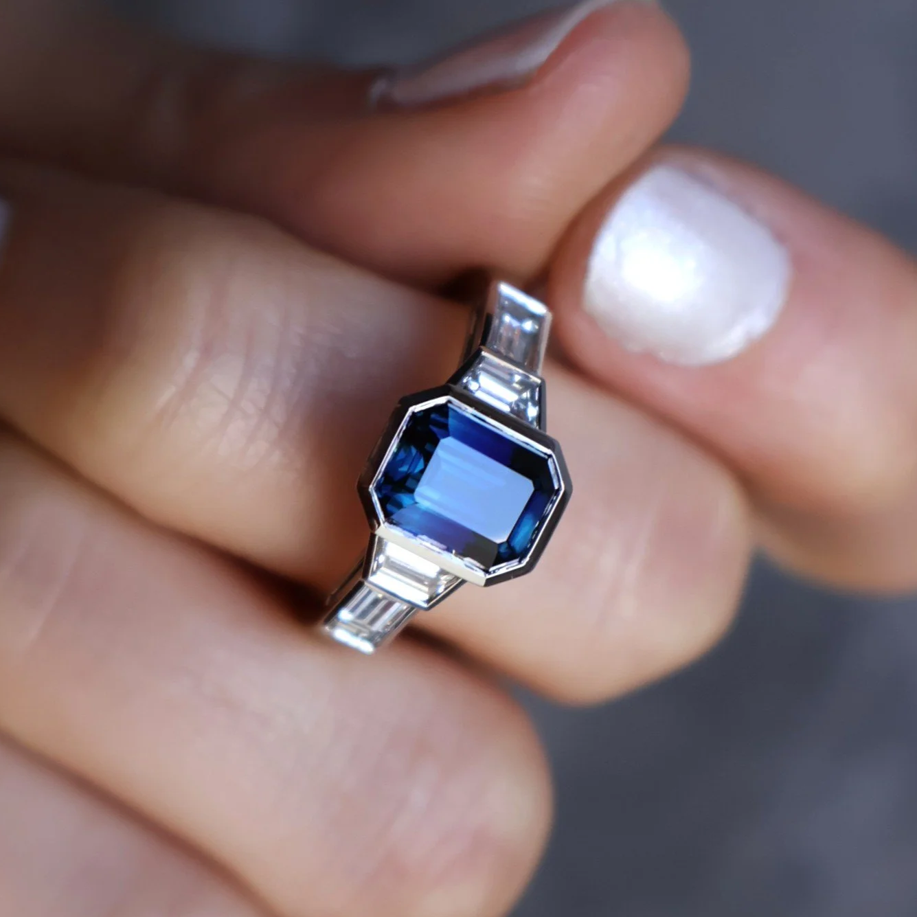 The bezel setting accentuates the sapphire’s clean lines, perfectly reflecting the geometric elegance of Art Deco design.