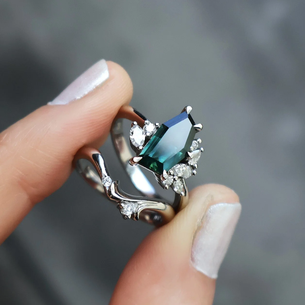 9. Freeform Teal Sapphire and Diamond Ring | Modern Duel Stone/Two Stone Style